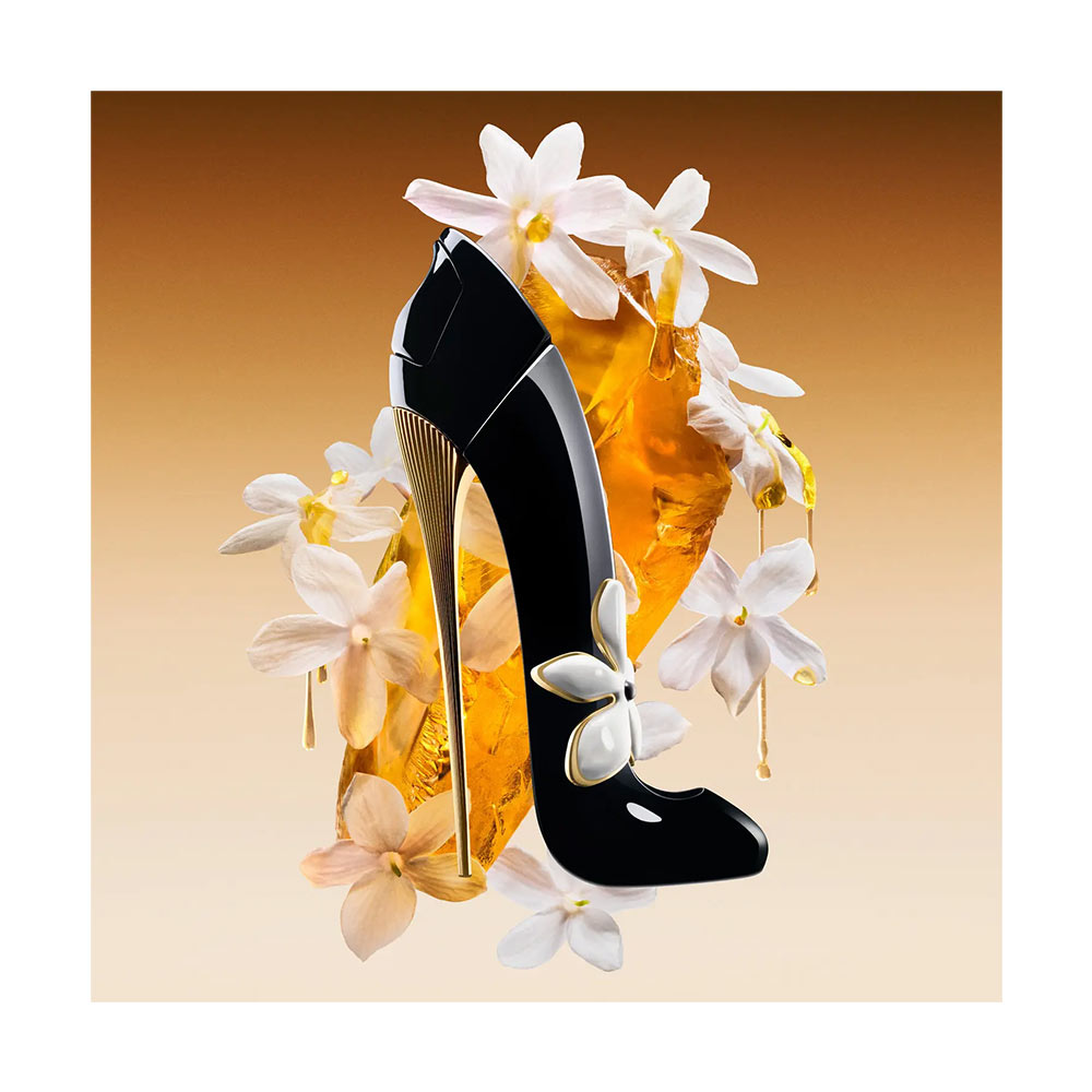 Der elegante, skulpturale Flakon in Form eines High Heels ist mit glänzendem schwarzem Lack überzogen und mit einer weissen Jasminblüte gekrönt, dem Emblem des Hauses, das für Weiblichkeit und Kraft steht. Auf einem hauchdünnen goldenen Absatz balancierend, verkörpert er die hyperfeminine Haltung von Good Girl – kühn, verführerisch und unmöglich zu ignorieren.