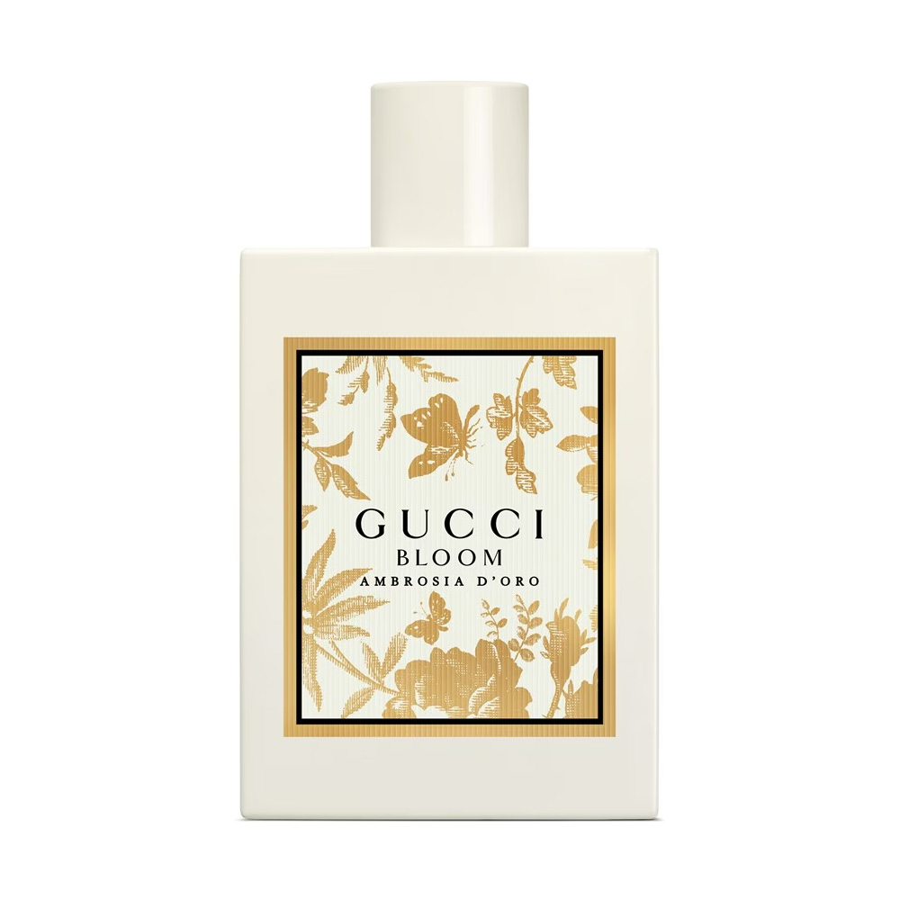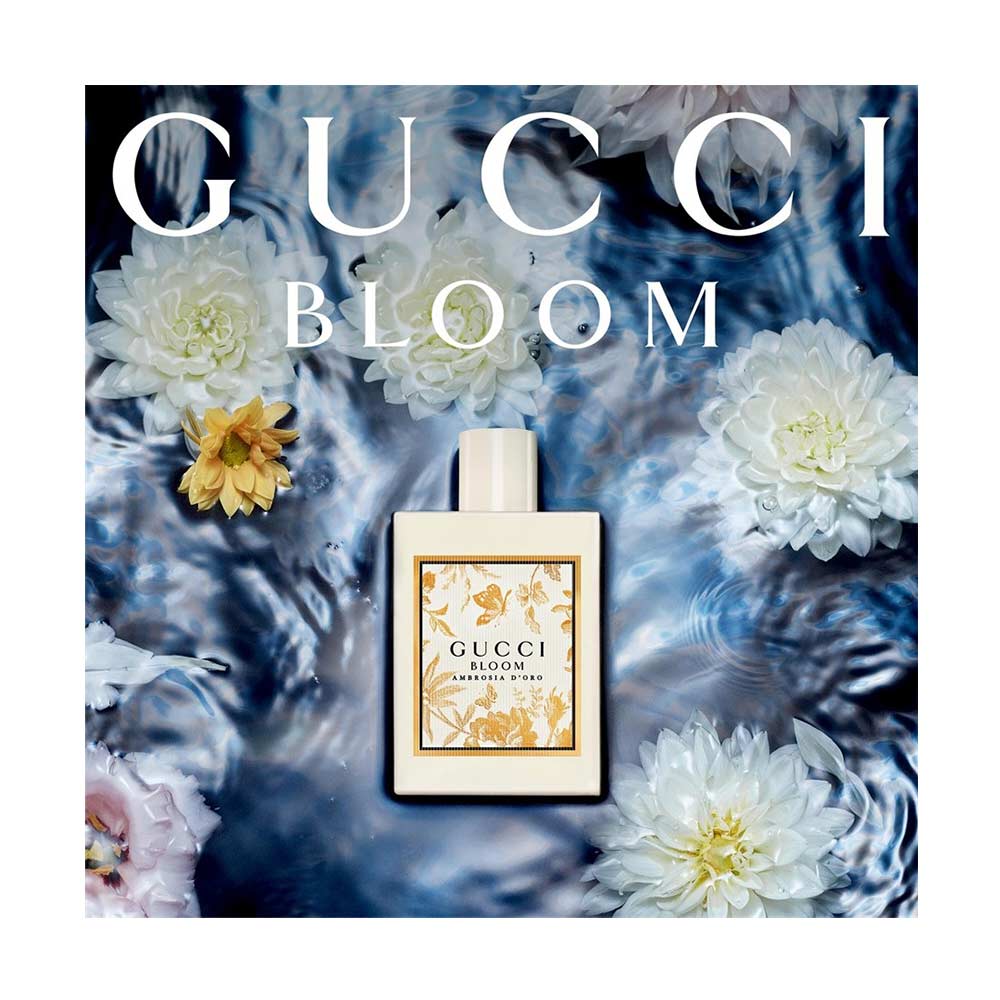 Mit Gucci Bloom Ambrosia d’Oro präsentiert das Haus einen blumigen, moschusartigen Duft, der das charakteristische weisse Bouquet der Gucci Bloom Kollektion neu interpretiert. Im Herzen offenbart der strahlende Golden Queen-Akkord samtige Aprikosennoten, die sich mit der Frische von Jasmin-Hedione und dem unverkennbaren Gucci Bloom Bouquet vereinen. Jasmin Sambac-Absolue entfaltet frische, lebendige Nuancen, während das Absolue der Tuberose einen sinnlichen Akzent setzt. Der elfenbeinfarben lackierte Flakon des Gucci Bloom Ambrosia d'Oro Eau de Parfum präsentiert sich in der charakteristischen eckigen Form mit Herbarium-Motiv.