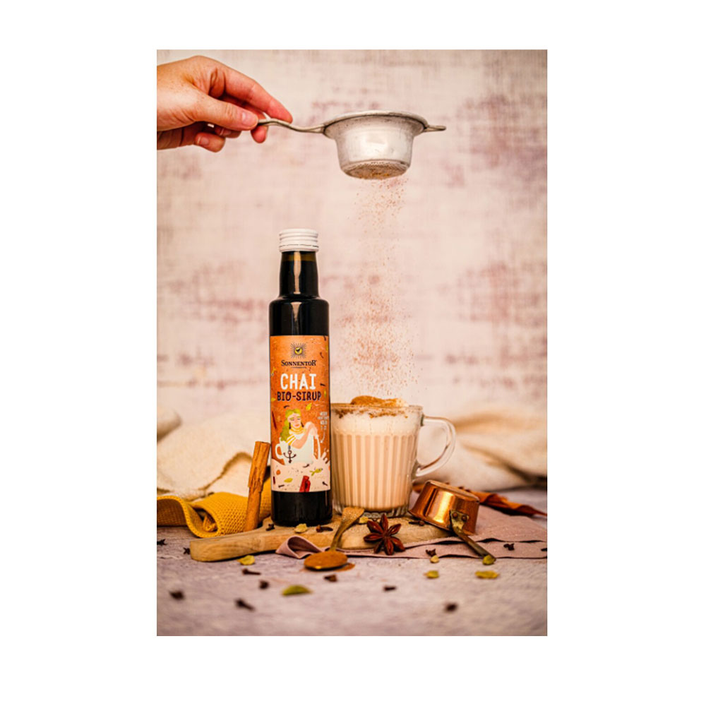 Kleopatras Beauty-Trick lässt auch dein Latte-Glas ziemlich gut aussehen. Für den schnellen Chai-Genuss geht dieser Sirup aus Schwarztee und einer aromatischen Gewürzmischung mit Zimt, Nelken und Kardamom in (Pflanzen-)Milch baden. Eins, zwei, Chai, fertig!