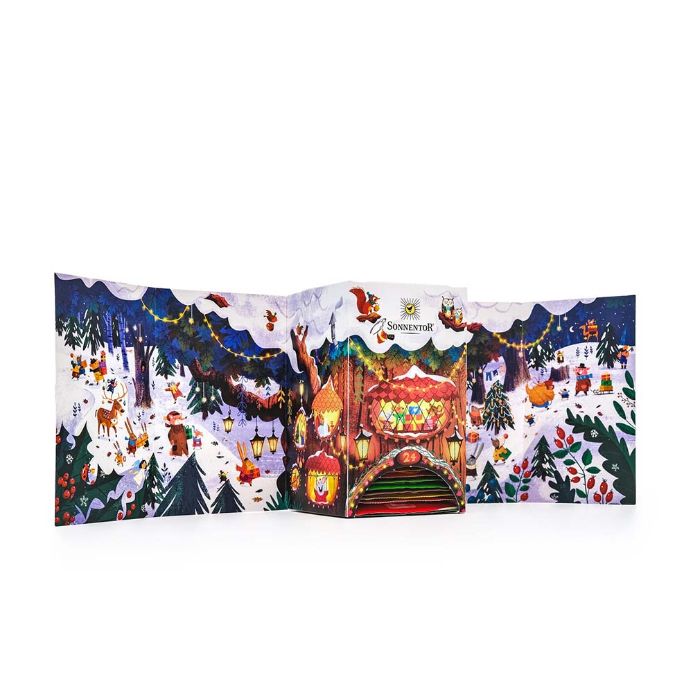 Tee Adventkalender mit 24 Aufgussbeutel Bio-Teemischungen zur Einstimmung auf Weihnachten. Oh du genussvolle Wartezeit! Tag für Tag hält dieser Adventkalender eine neue Tee-Überraschung für dich bereit. Ausserdem bringen dir zahlreiche digitale Erlebnisse Weihnachten täglich etwas näher. Sammle mit Geschick Teezutaten in deiner virtuellen Tasse oder verwandle dich selbst in den Nikolaus. Dank neuer Faltung ist der Adventkalender aufgeklappt nun grösser und bereichert mit seiner liebevollen weihnachtlichen Gestaltung deine Umgebung als festlicher Blickfang.