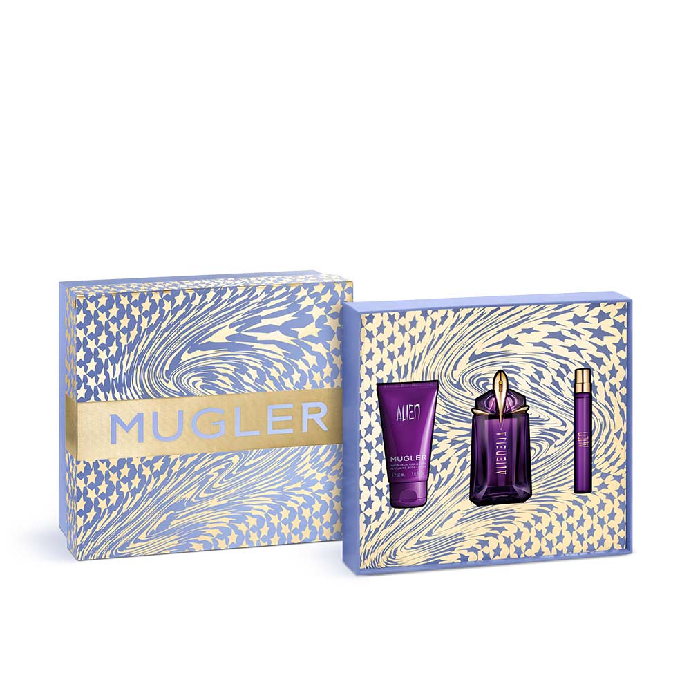 Dieses wunderschöne Geschenkset enthält ein Thierry Mugler Alien Eau de Parfum 60ml, eine Perfuming Body Lotion 50ml und einen Eau de Parfum Taschenspray 10ml.