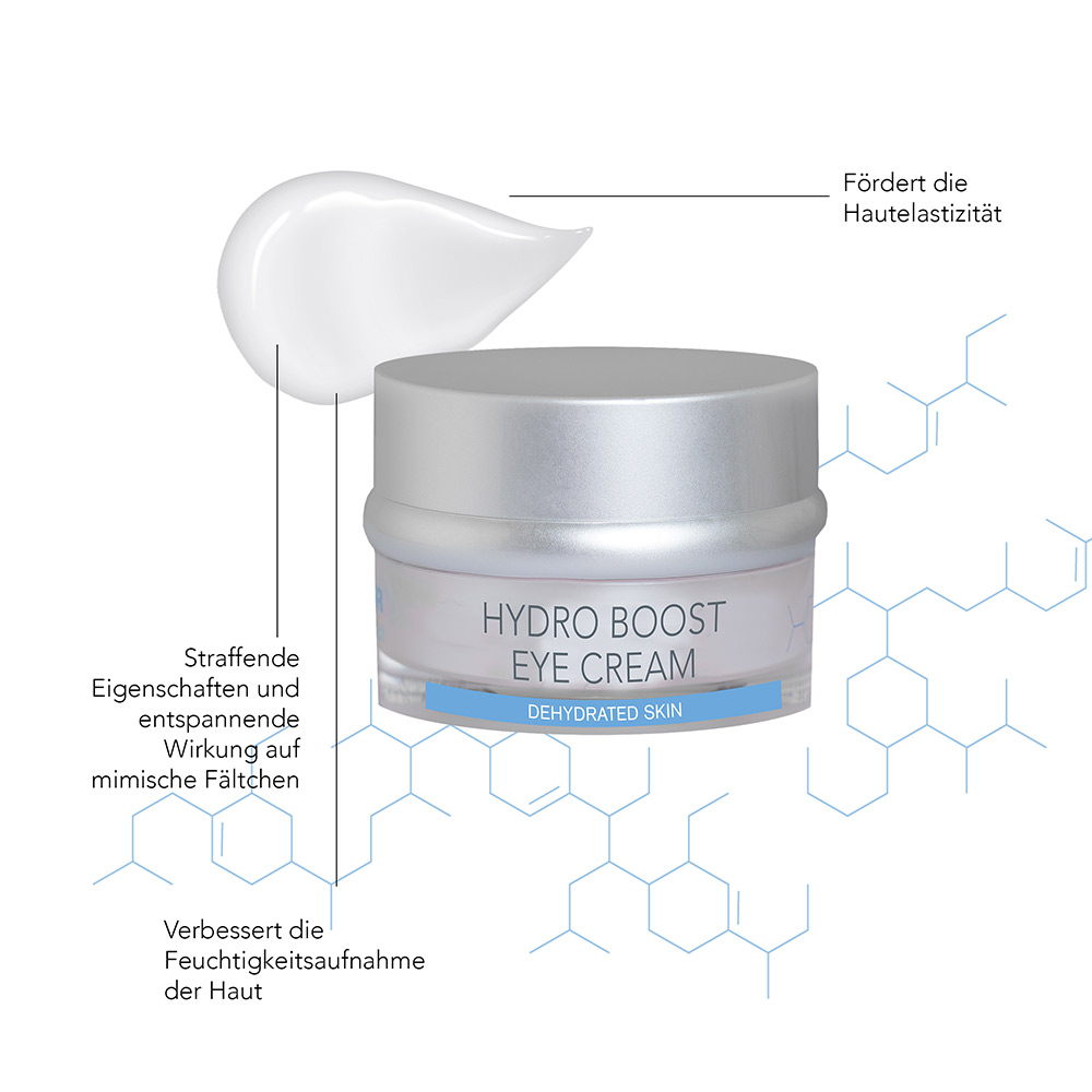 Die kraftvolle Kombination aus vier unterschiedlichen Hyaluronsäure-Molekülen und Rotalgenextrakt sorgt für eine intensiv durchfeuchtete und straffe Augenpartie. Feine Linien und kleine Fältchen werden sichtbar geglättet, wodurch der Blick erfrischt und die Augenpartie jugendlicher und vitaler wirkt.