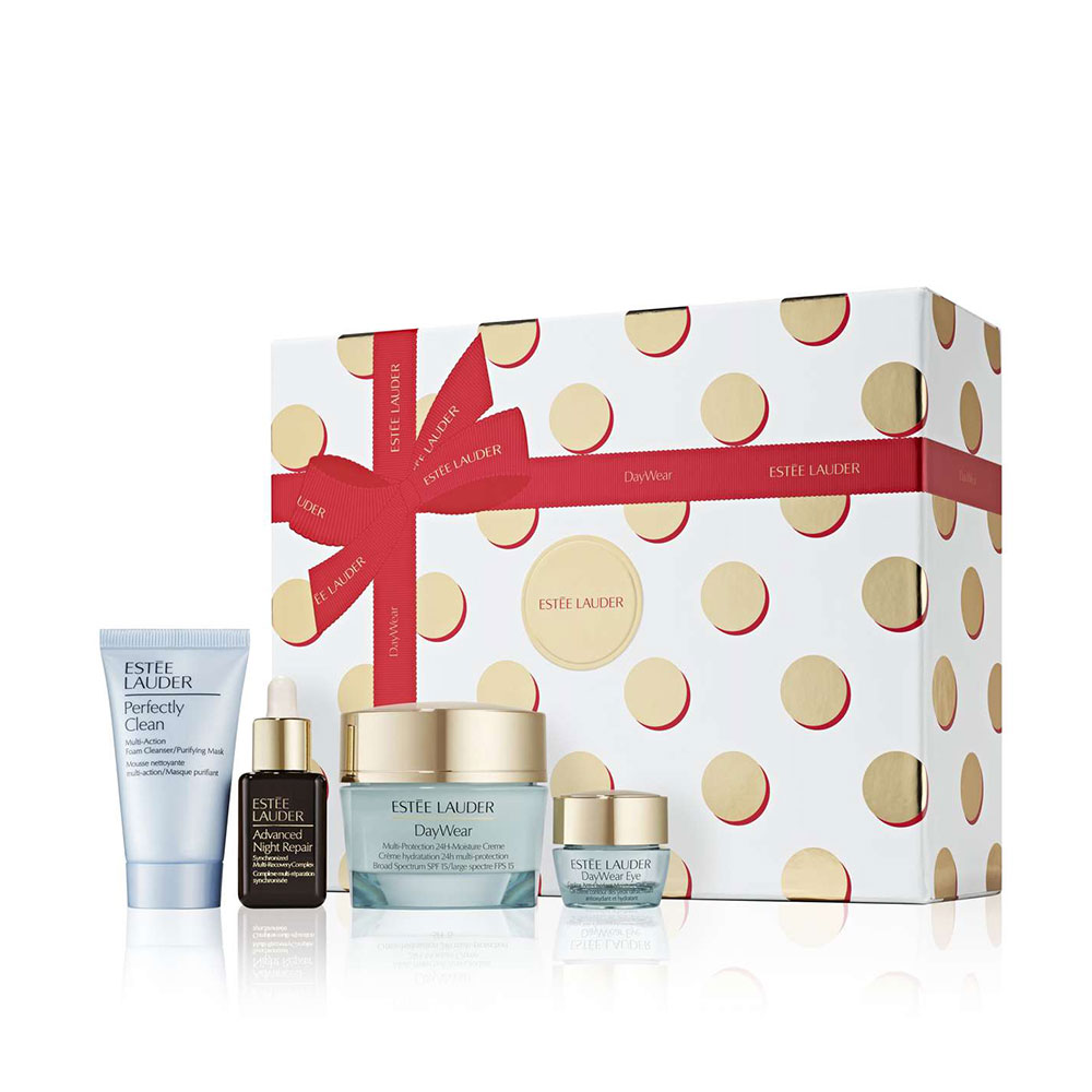 Inhaltsstoffe Dieses Geschenkset enthält: 1 DayWear Multi-Protection Anti-Oxidant 24H-Moisture Creme SPF 15, Originalgrösse (50ml), 1 Perfectly Clean Multi-Action Foam Cleanser/Purifying Mask, Luxus-Reisegrösse (30ml), 1 DayWear Eye Cooling Anti-Oxidant Moisture Gel Creme, Luxus-Reisegrösse (5 ml), 1 Advanced Night Repair Synchronized Multi-Recovery Complex, Luxus-Reisegrösse (15ml). |